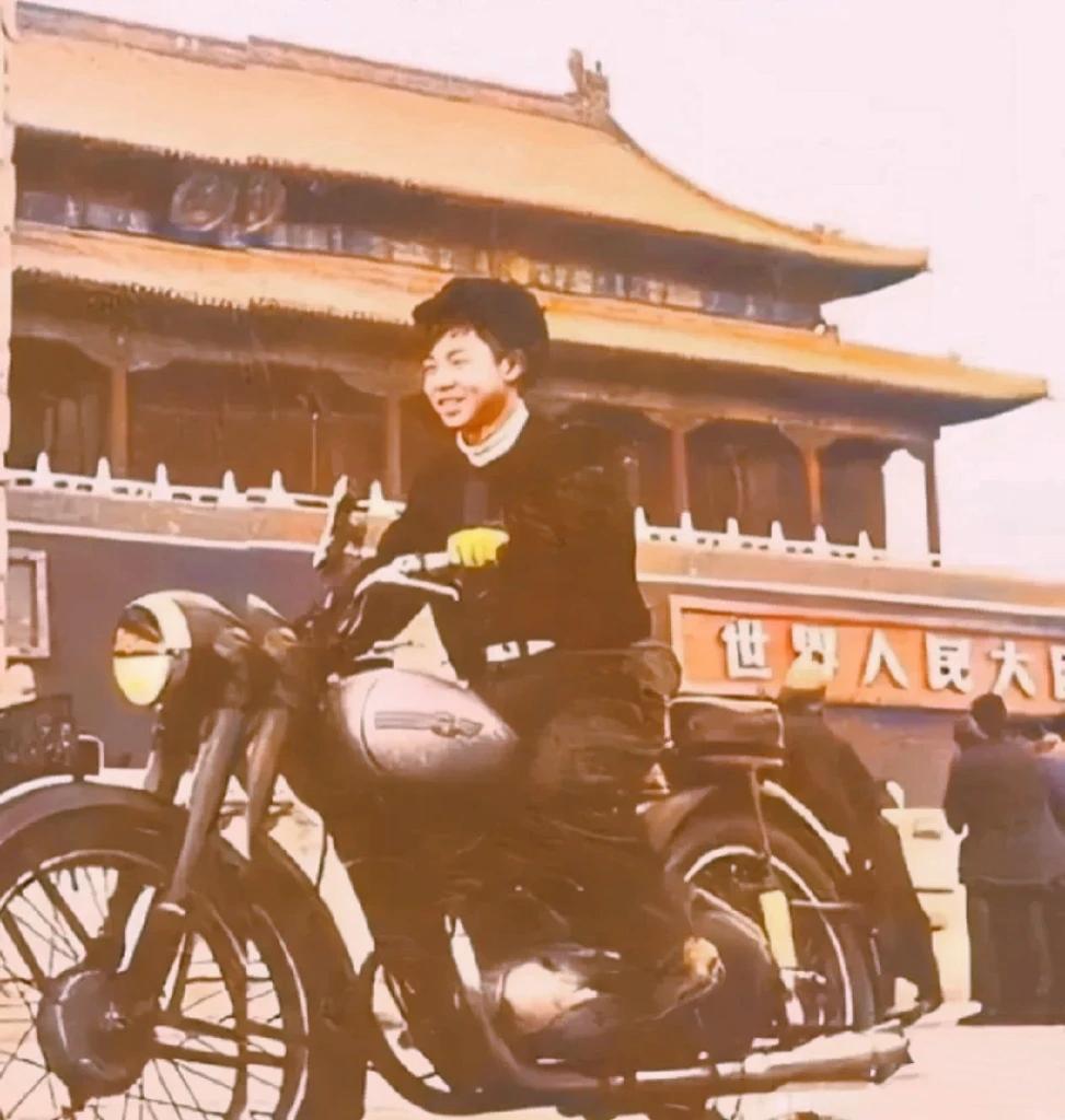 1958年,雷锋去辽宁出差经过北京时,在北京天安门城楼前的留影。照片中,雷锋骑着一辆摩托,看起来非常的酷。
